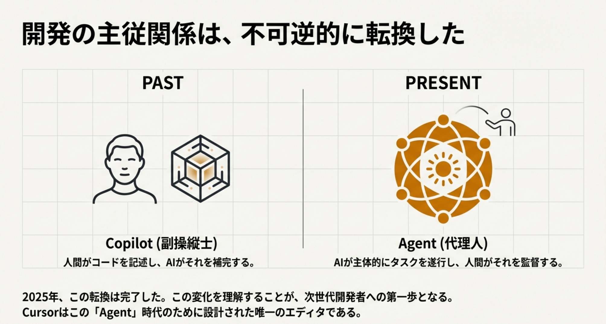 開発者に求められるスキルは、「コードを速く書くこと」から、「AIエージェント(Composer/Agent)に対し、的確なコンテキスト(Rules/MCP)を与え、そのアウトプットを指揮(Orchestration)すること」へとシフトしています。