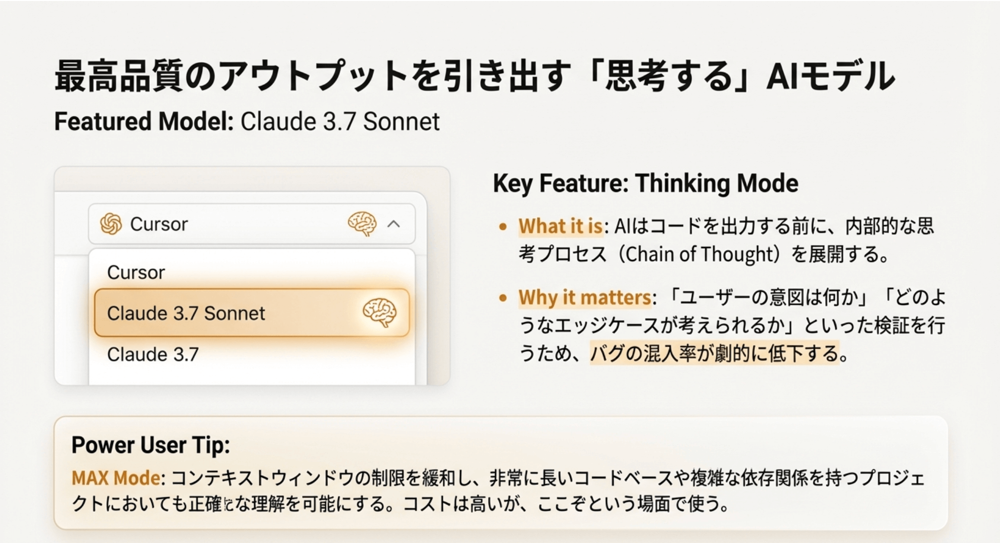 Cursorでは、Claude 3.7 Sonnetを選択する際、「Thinking Mode」を有効にするオプションが提供されています。