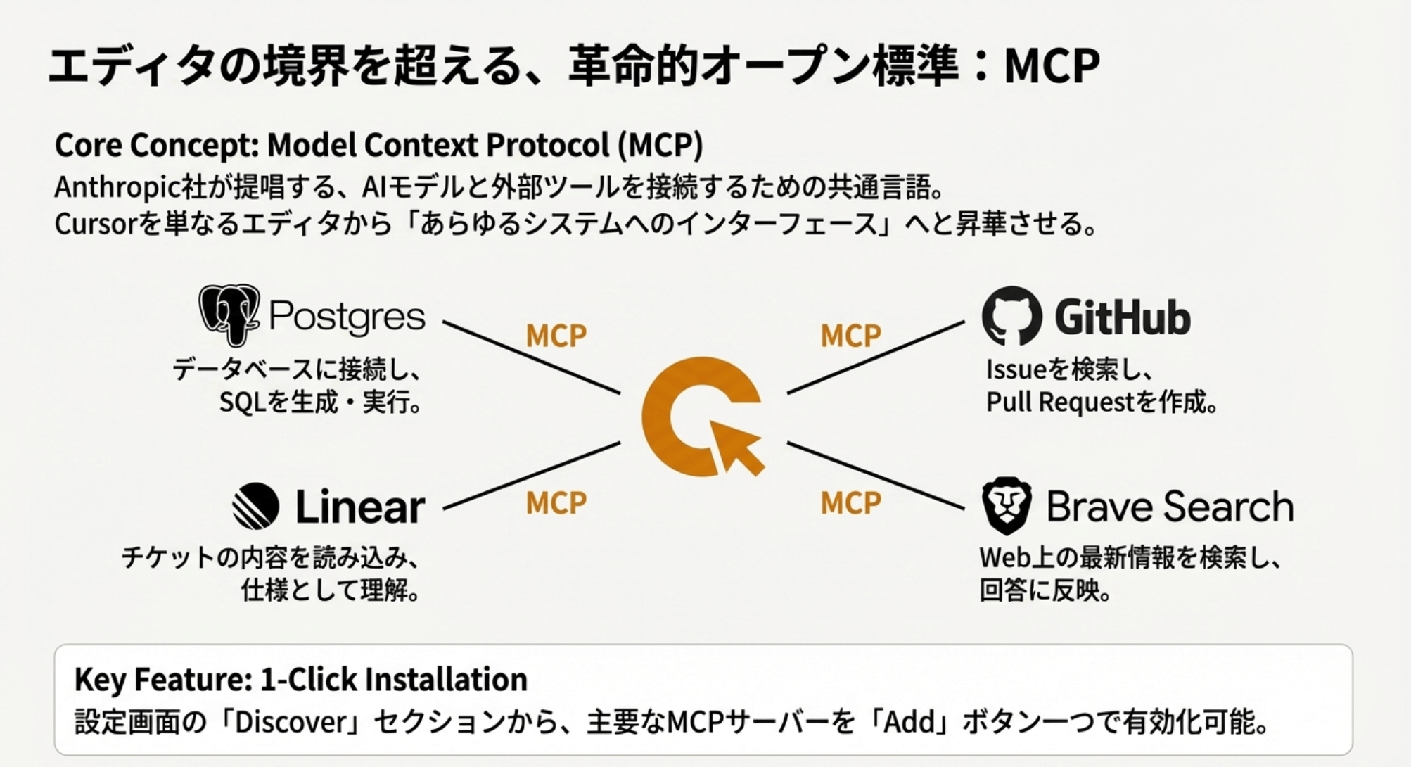 MCPは、Anthropic社が提唱するオープン標準であり、AIモデルと外部のデータソースやツールを接続するための共通言語です。これにより、Cursorは単なるテキストエディタの枠を超え、あらゆる外部システムへのインターフェースとなります。