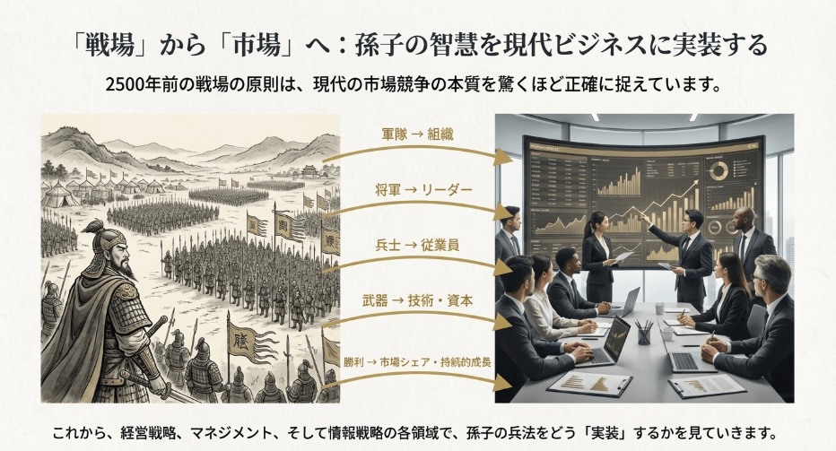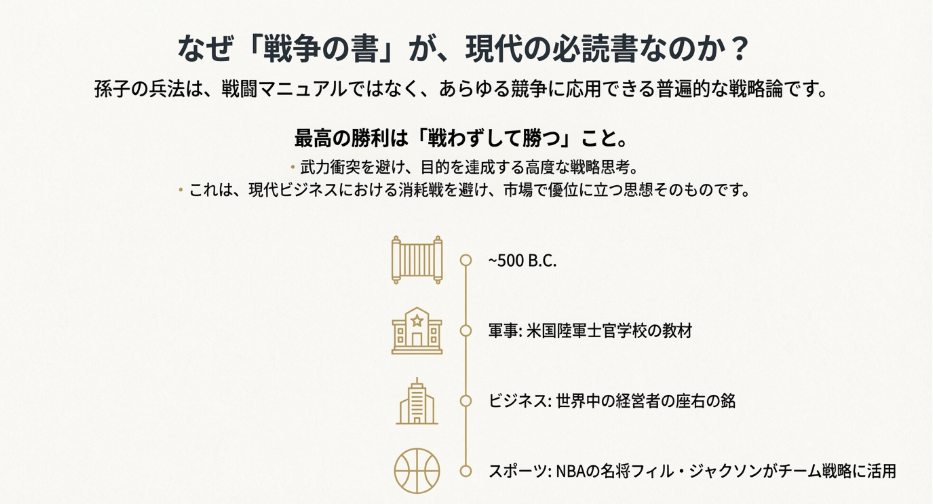 その答えは、孫子の兵法が単なる軍事マニュアルではなく、あらゆる競争状況に応用できる普遍的な戦略論だからです。