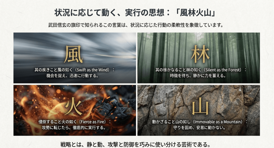 「知り難きこと陰の如く、動くこと雷震の如し」 (敵に意図を悟らせないことは暗闇のようであり、動くときは雷のように激しく) 風林火山にこれらを加えた6つの要素を使い分けることこそ、変幻自在の戦略なのです。