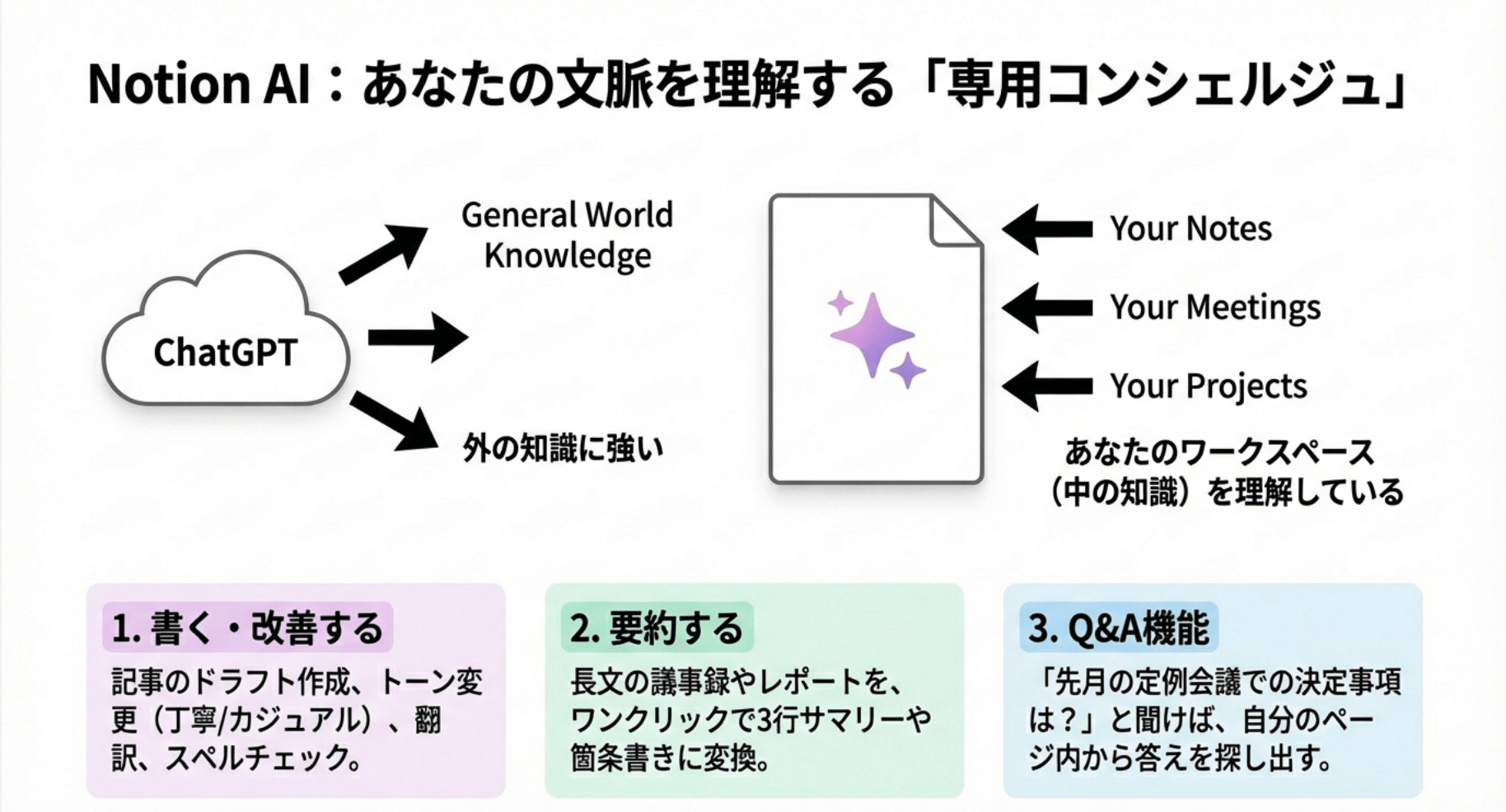 「Notionのページ内で文章を直接改善したい」「議事録を即座に要約したい」「既存のNotionコンテンツを参照しながら新しいコンテンツを作成したい」といったNotionと統合したワークフローにはNotion AIが最適です。