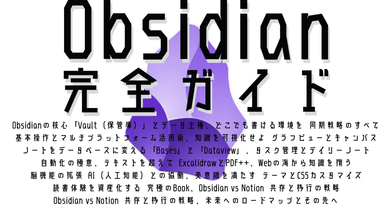 完全版では、新機能「Bases」や最強プラグイン「Dataview」によるデータベース化、AIとの協働、Obsidian Syncの全同期戦略、GitHub連携による上級者向けワークフロー、Obsidian vs Notionの徹底比較など大ボリュームで網羅しています。